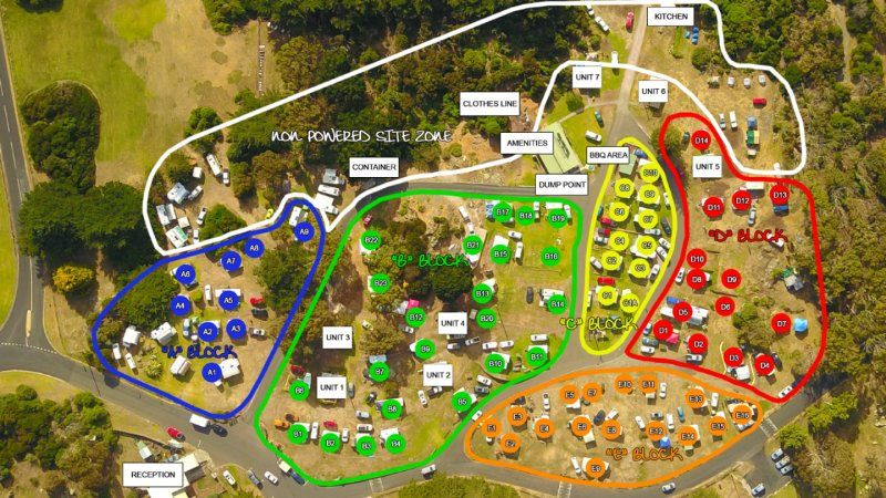 - Accommodation: Unpowered Sites, Powered Sites, Motorhome Sites, Onsite Vans, Rooms