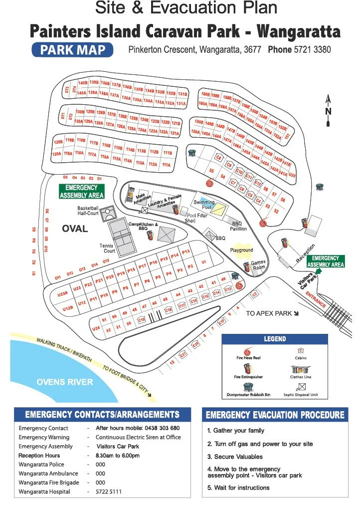 - Accommodation: Unpowered Sites, Powered Sites, Motorhome Sites, Cabins, Pet Friendly Cabins, Motel Rooms, Pet Friendly Motel Rooms